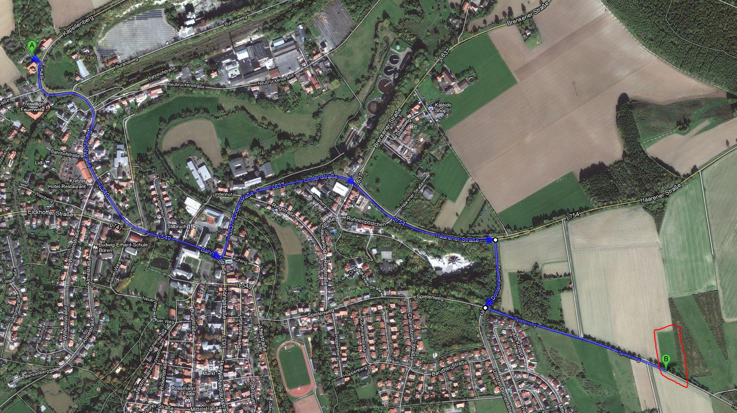 Die eingetragene Route Markiert das Clubhaus am Kapellenberg und führt im einfachsten Weg zum Platz.